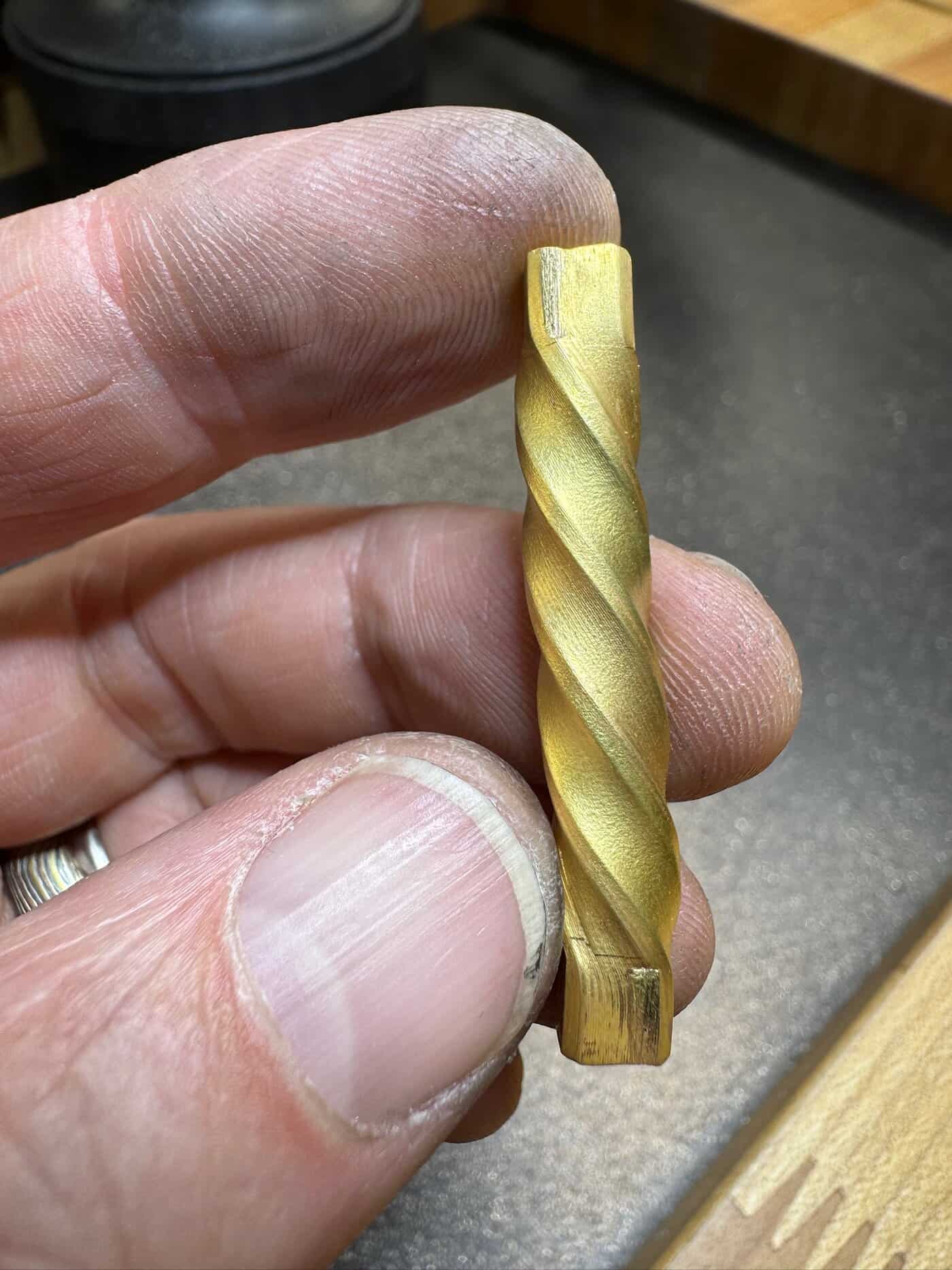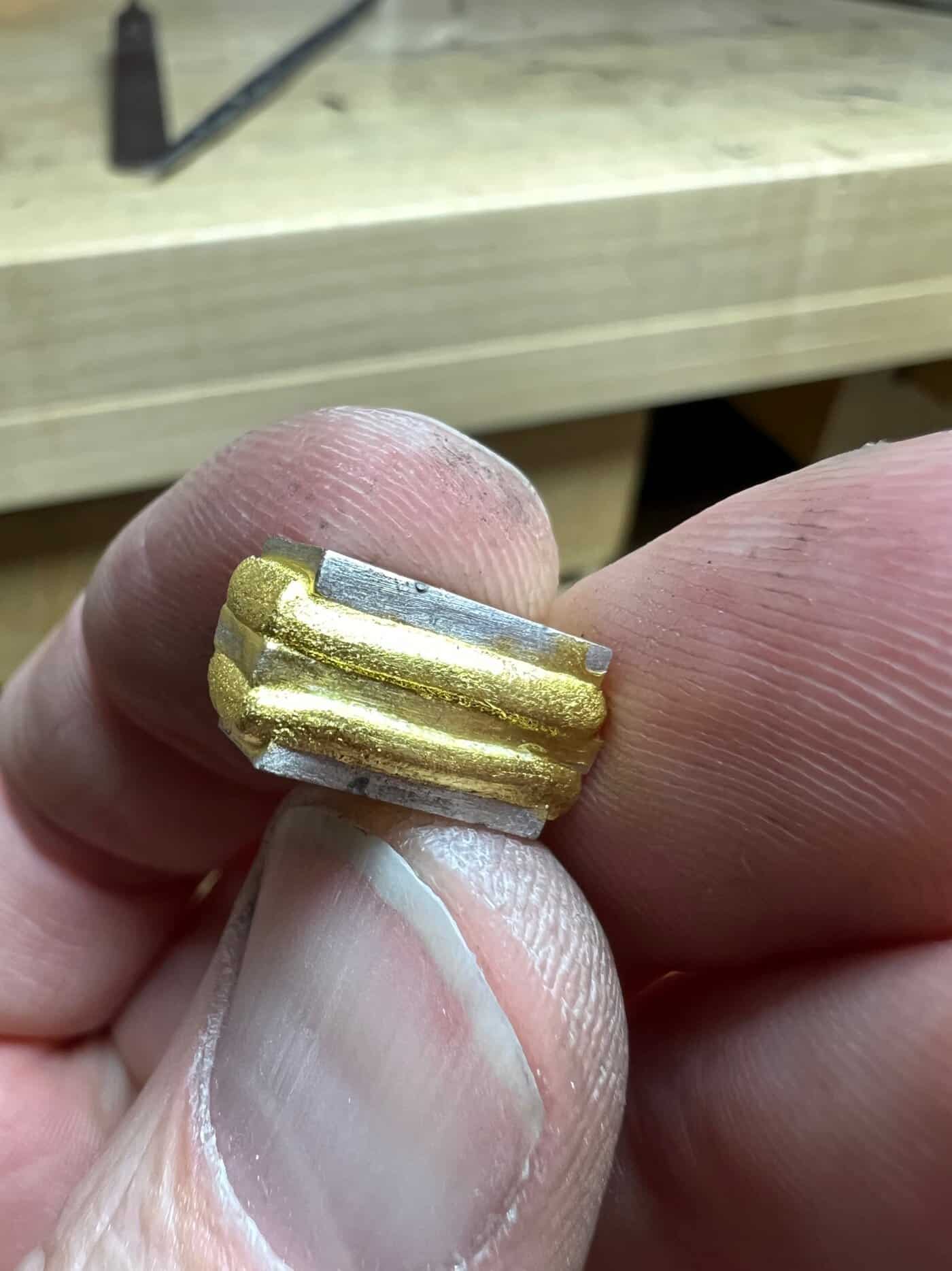 Aside from desirability, gold is special in the science of Mokume Gane. Gold is a soft metal, which will form liquid phase diffusion bonds with other metals without completely melting. The higher the karat gold, the purer the form, and the softer the metal. While 24 karat gold is not as durable as lower karat alloys, it is the most valuable. The alloying metals in lower karat gold make it less expensive and more durable, but also less valuable and considerably harder to melt. Getting the perfect alloys for each Mokume Gane design is both a science and an art. After decades perfecting his craft, Arn has hit, well, gold.