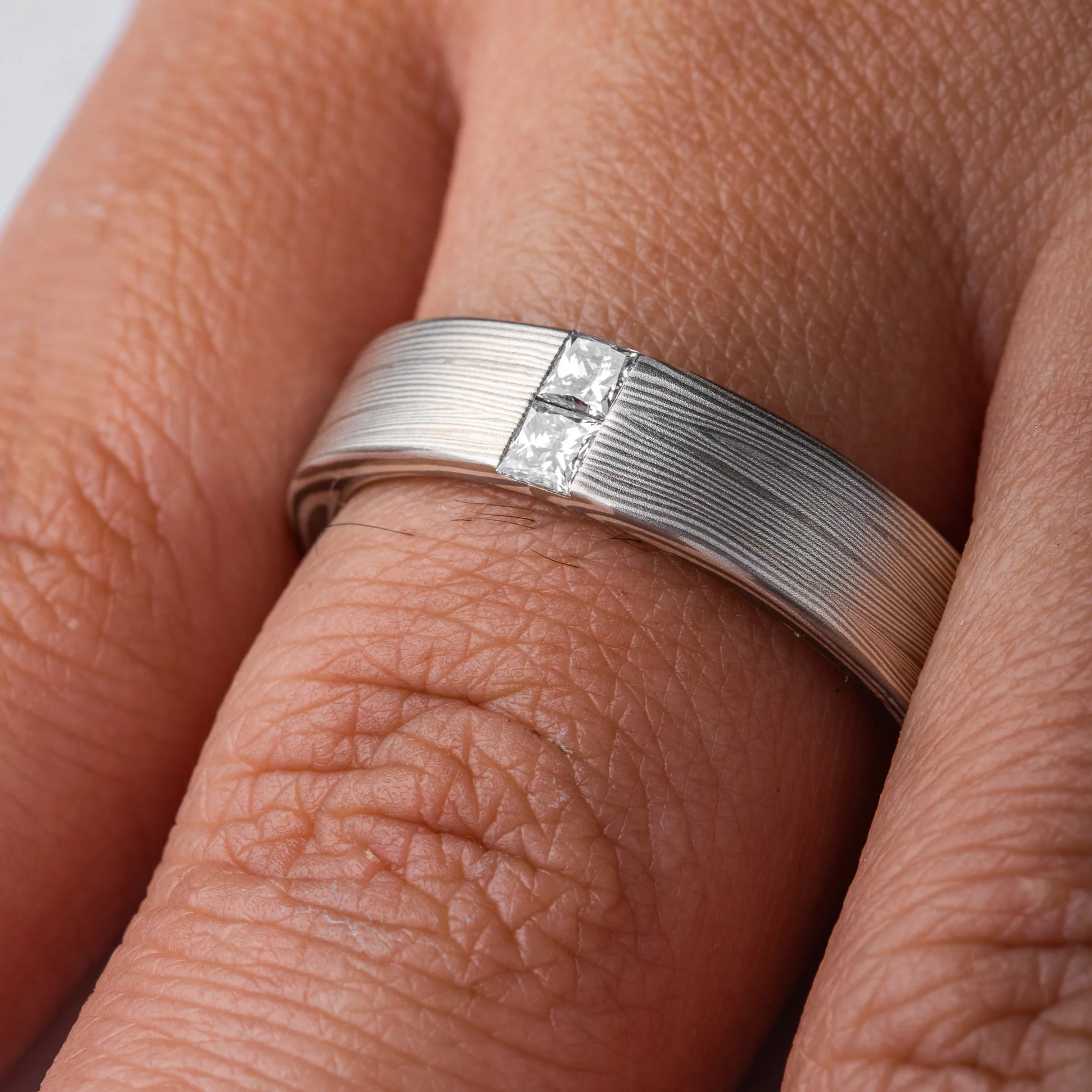 This classic and elegant feeling mokume gane ring is shown in the Flow pattern with Mokume Knots and the Smoke metal combination with a satin finish and a flat profile. The Smoke palette features 14kt white gold, palladium and sterling silver. This ring also features two princess cut diamonds set side by side in a vertical orientation. Interested in creating a beautiful custom ring like this piece? Get started with our Design Guide!