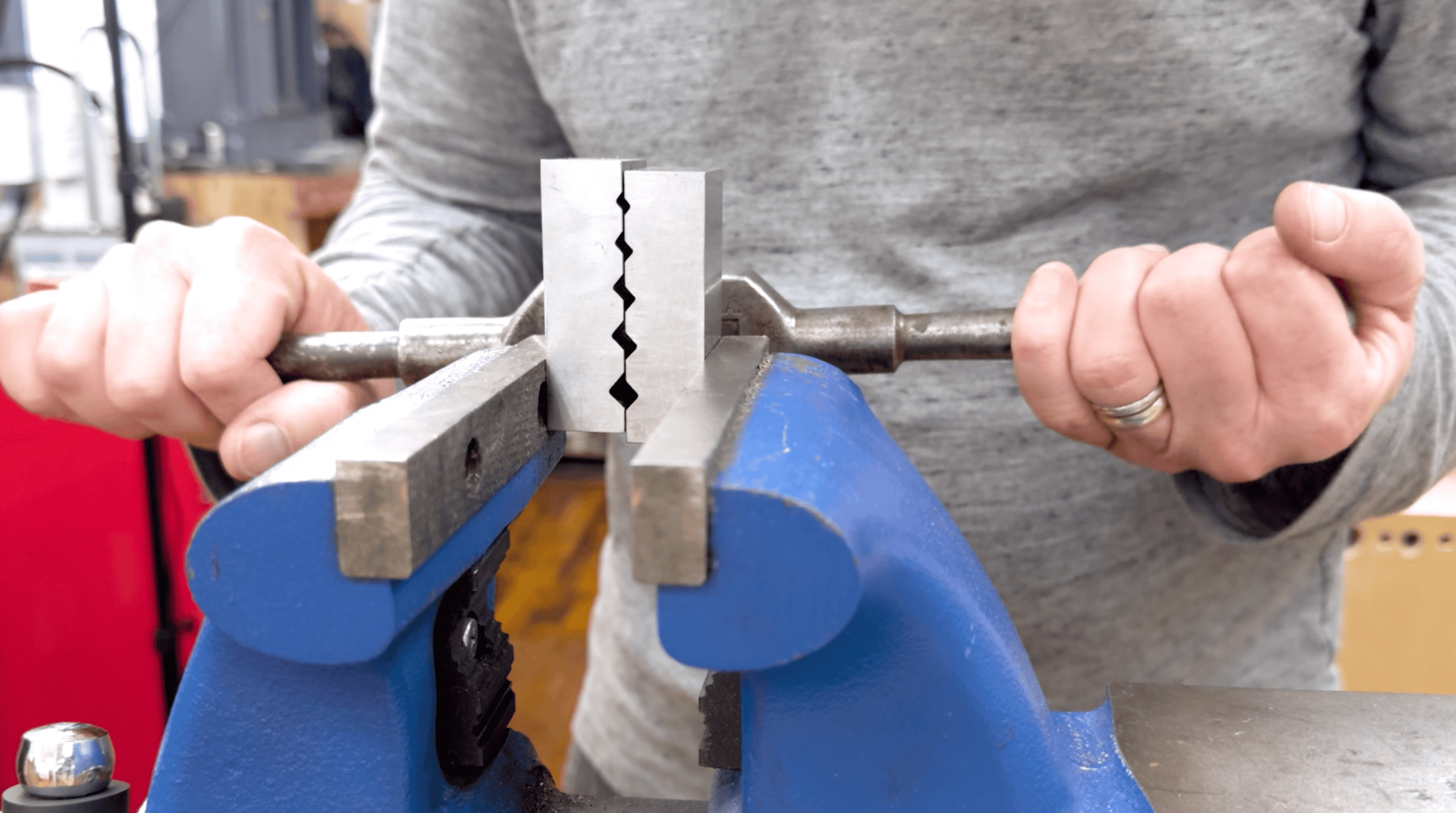Forged pattern, long thin lines with patterned knots throughout, knots are eyelike in shape.