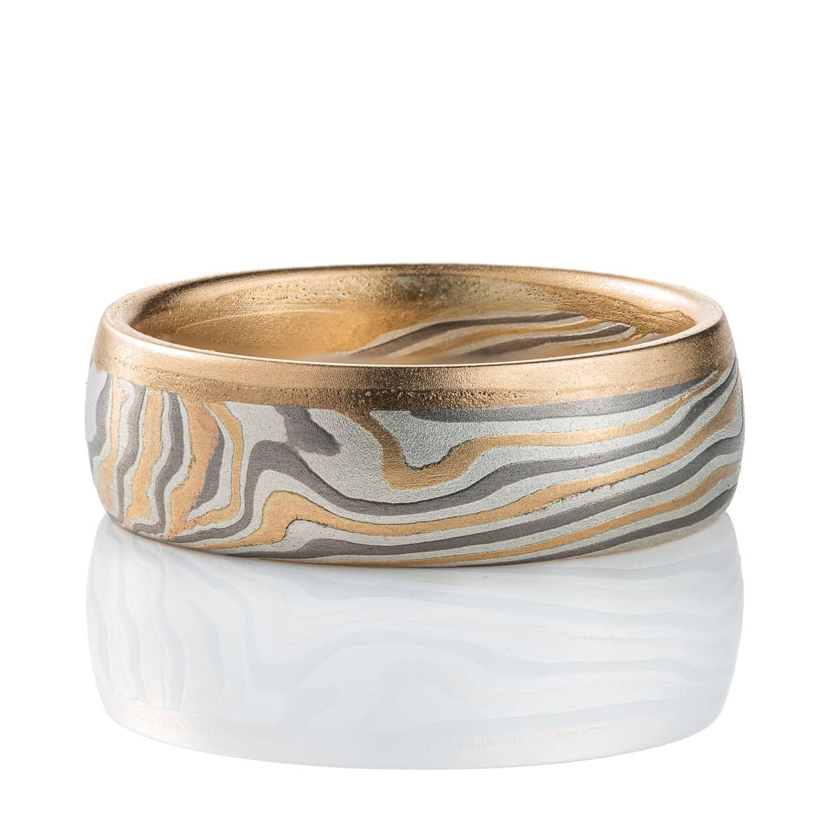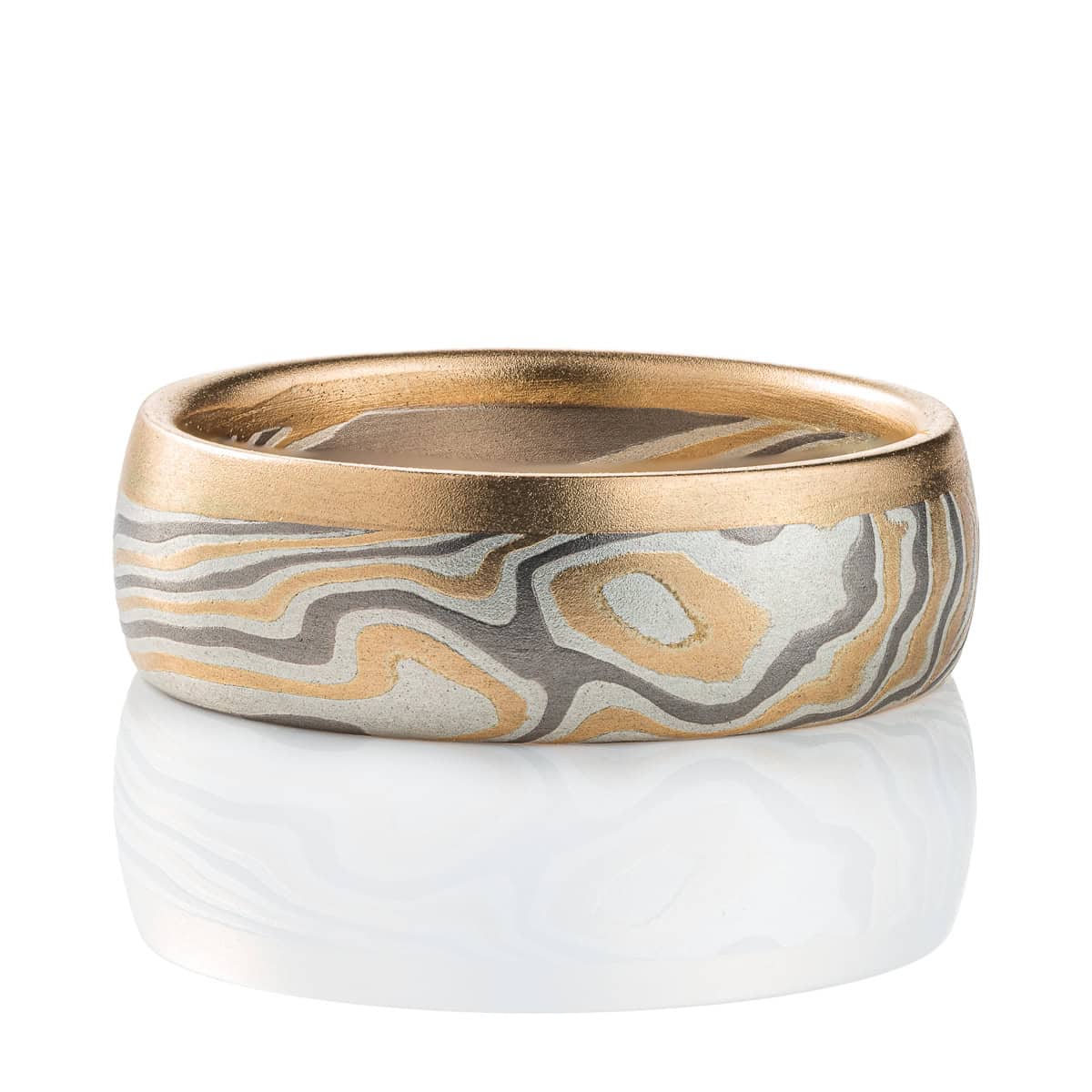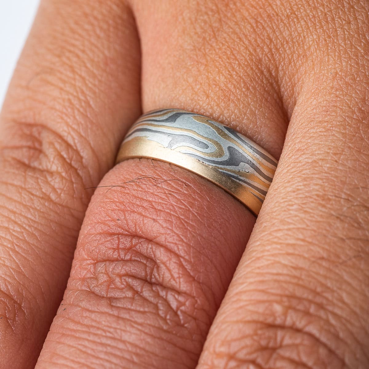 Customization options available! All Arn Krebs Mokume Gane Rings are CUSTOM and made-to-order. Rings are available in any size, width, profile, pattern, metal combination and finish. All rings are made individually from start to finish, so each one is completely unique and will vary slightly from what is pictured. Variations in color and patterning are natural features of Mokume Gane and photos shown are for illustration purposes only.