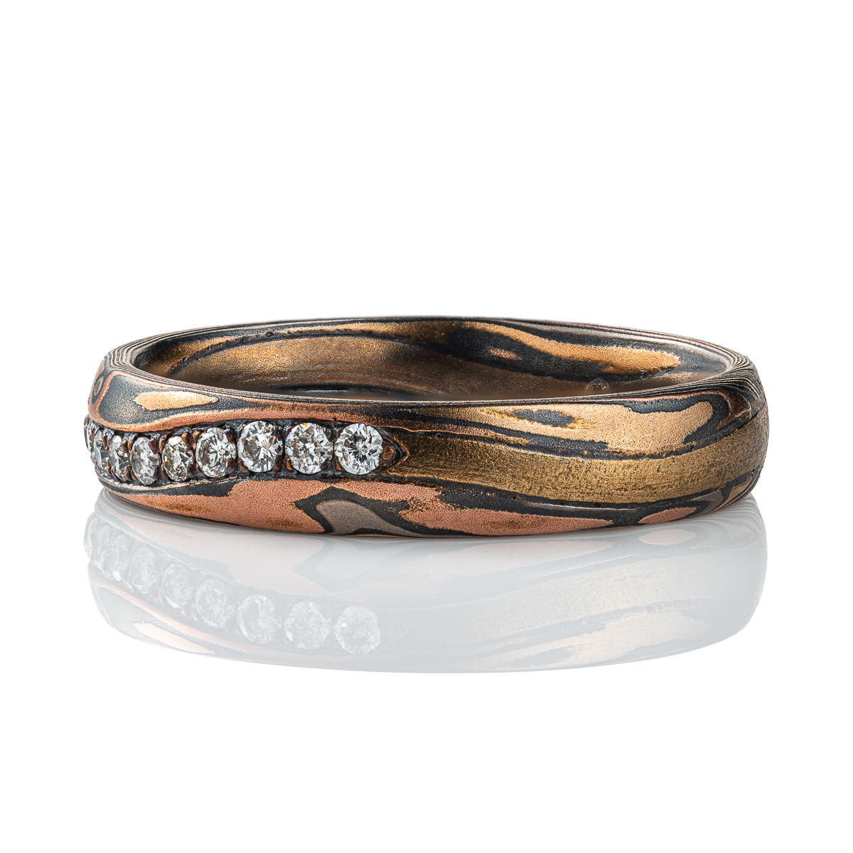 Woodgrain patterned mokume gane ring set featuring a line of gently wandering diamonds set into one of the bands.