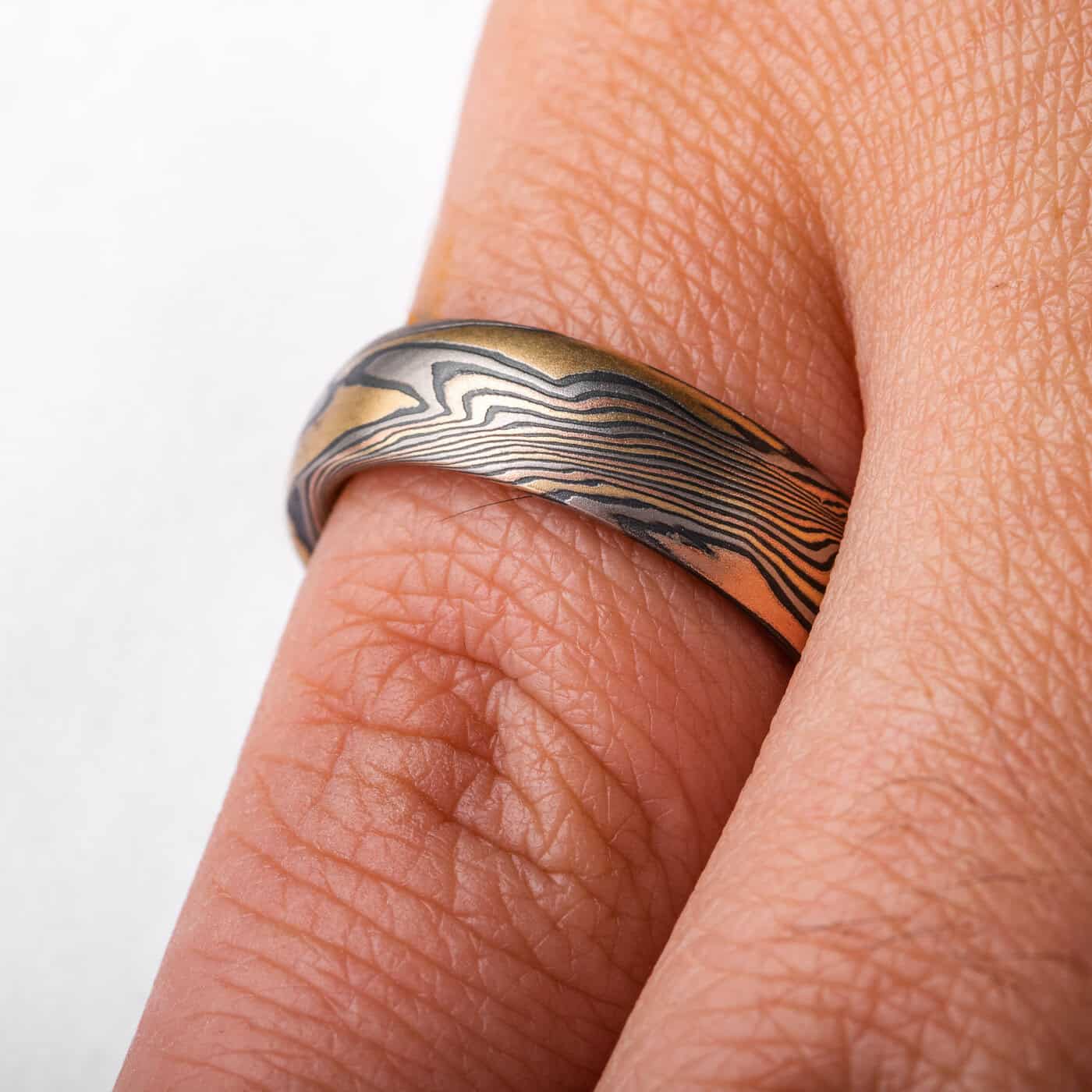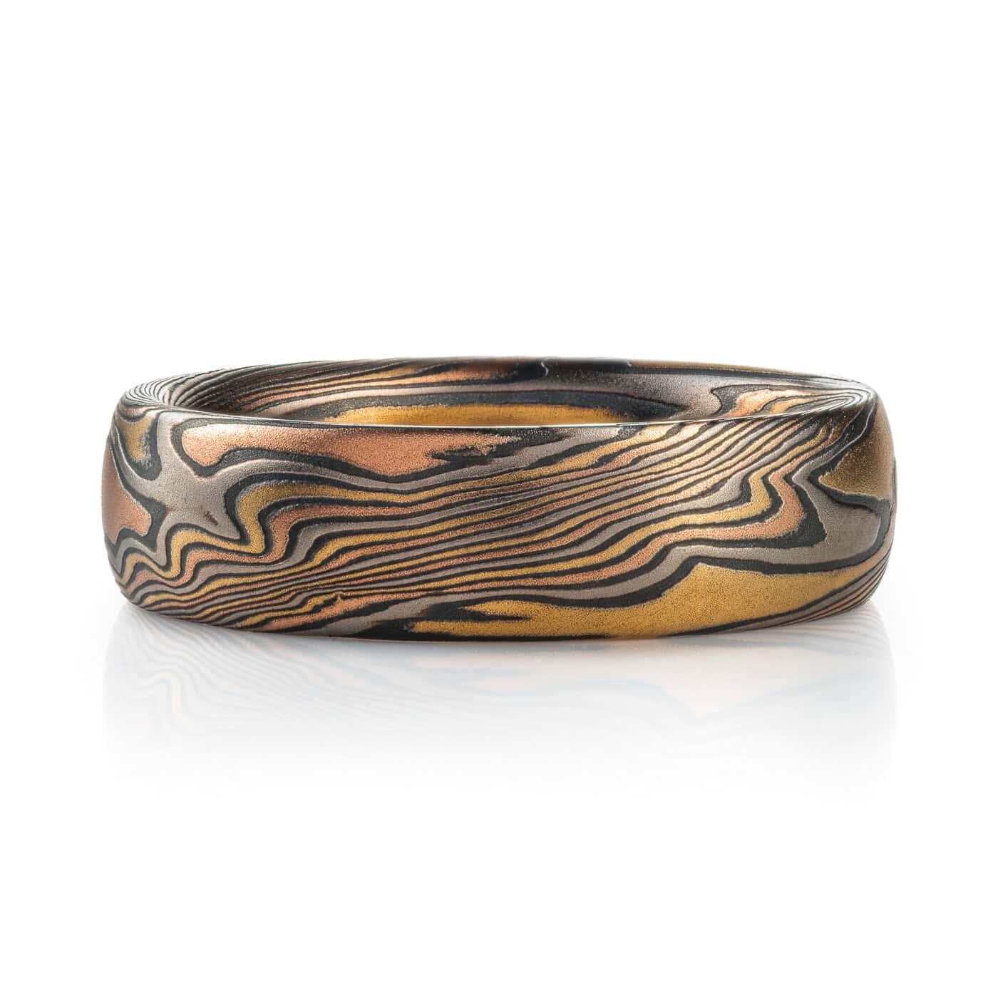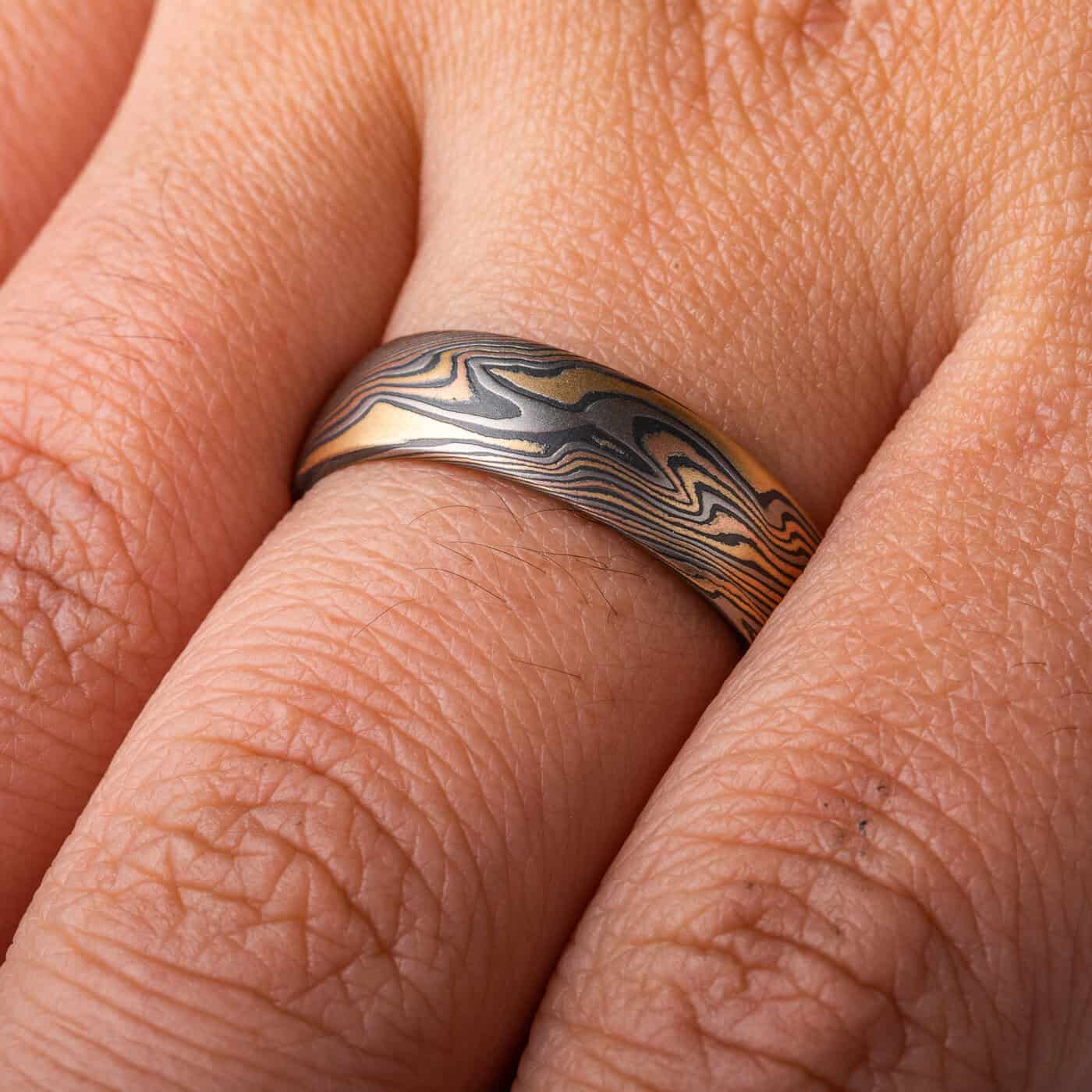 Customization options available! All Arn Krebs Mokume Gane Rings are CUSTOM and made-to-order. Rings are available in any size, width, profile, pattern, metal combination and finish. All rings are made individually from start to finish, so each one is completely unique and will vary slightly from what is pictured. Variations in color and patterning are natural features of Mokume Gane and photos shown are for illustration purposes only.