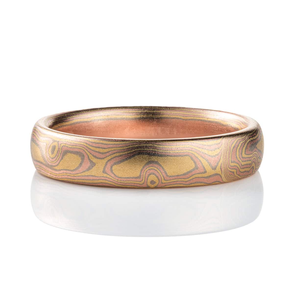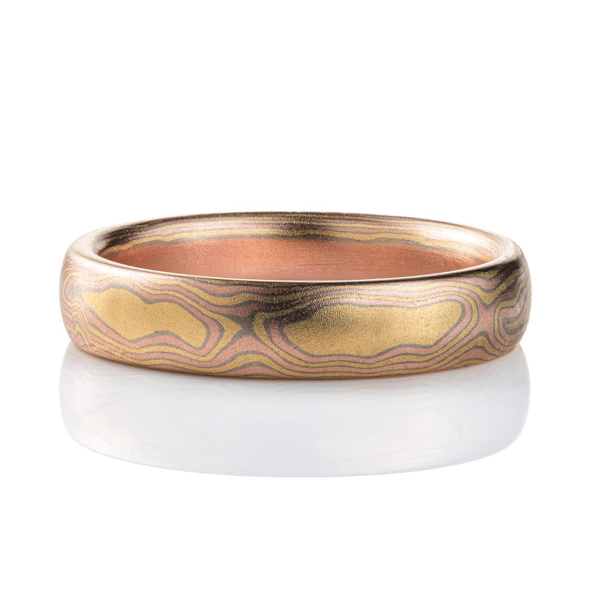 This beautifully striking Mokume Gane band is shown in the woodgrain pattern and our Blaze palette with a satin finish. Blaze is our all-gold palette, and features 18kt yellow gold, and 14kt red gold and palladium.