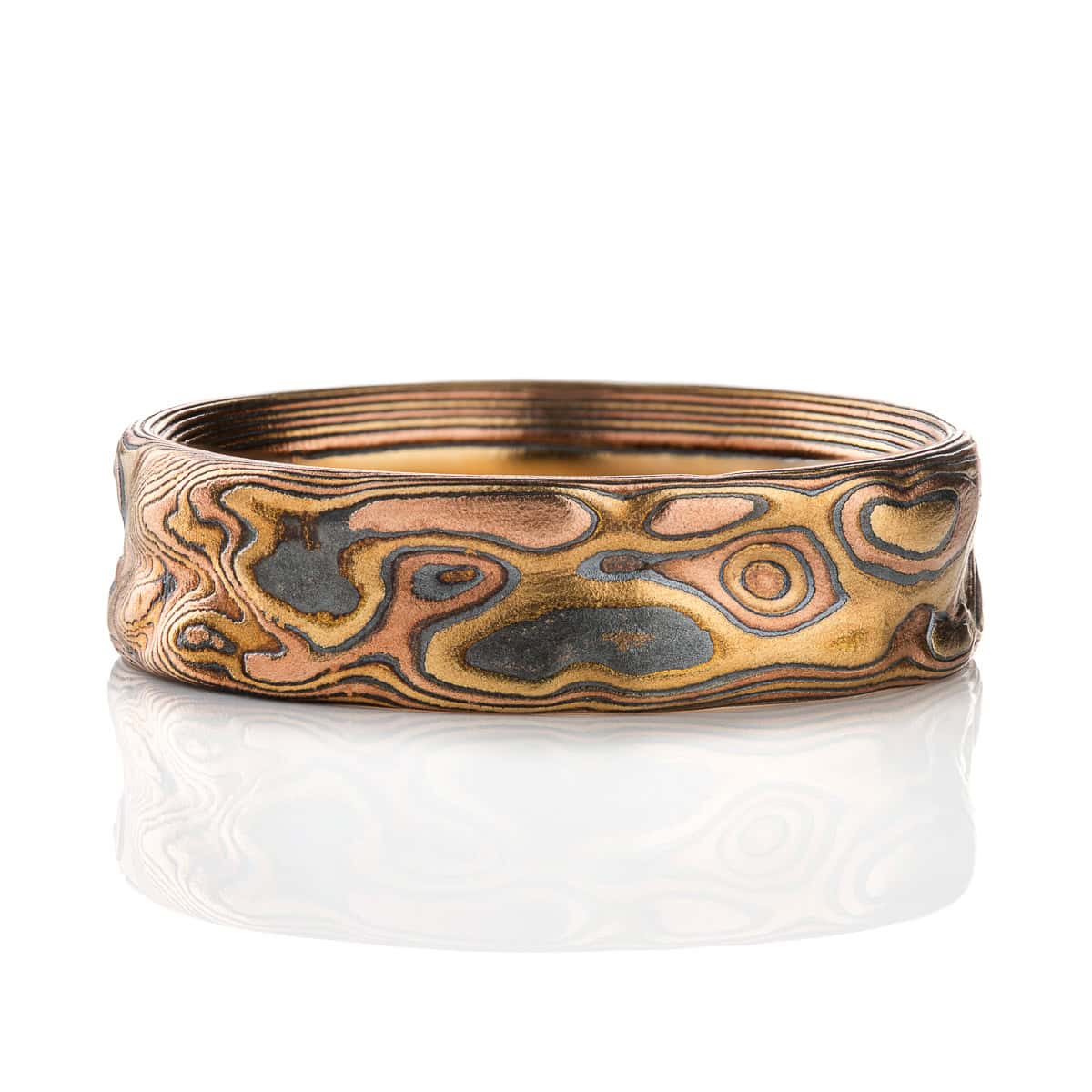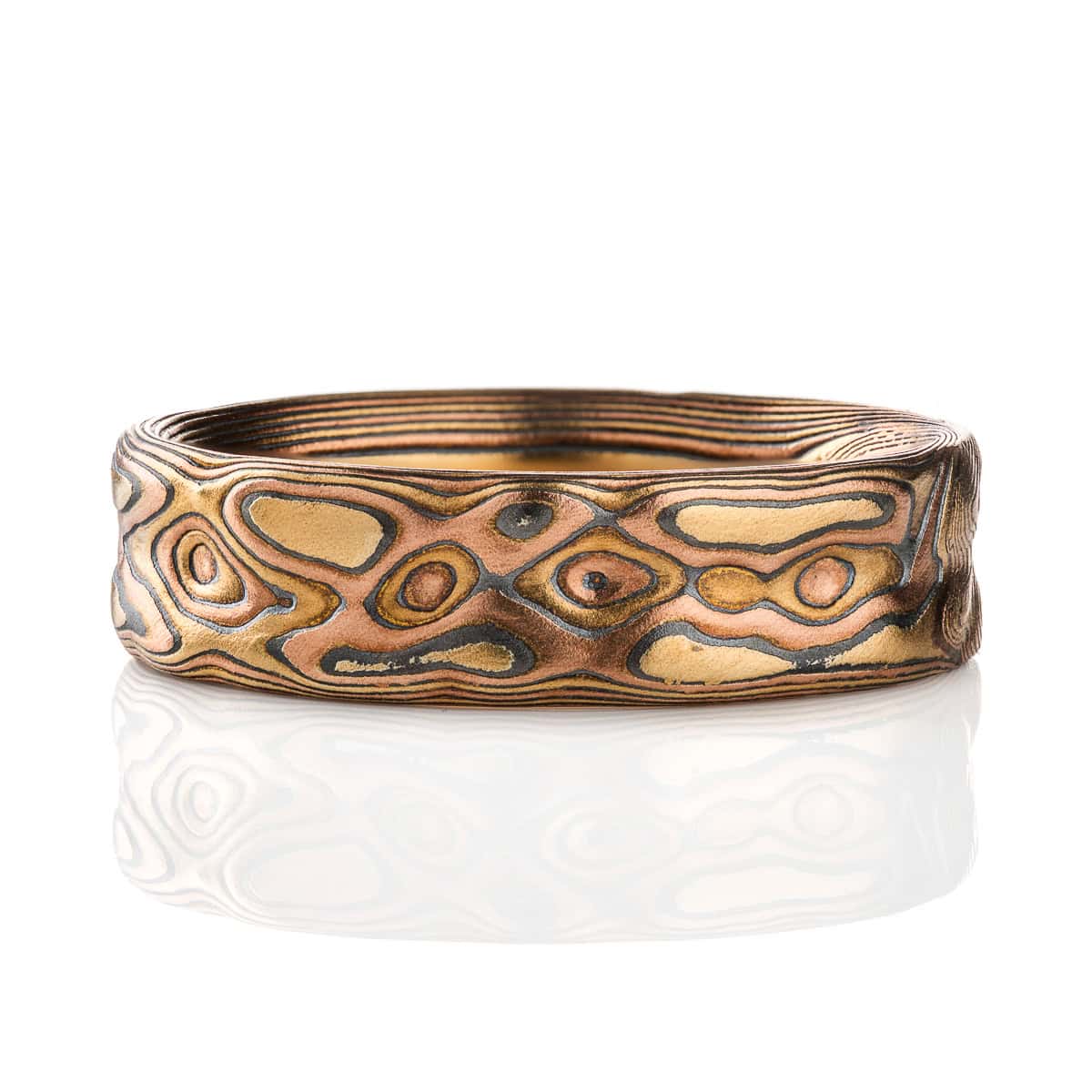 Customization options available! All Arn Krebs Mokume Gane Rings are CUSTOM and made-to-order. Rings are available in any size, width, profile, pattern, metal combination and finish. All rings are made individually from start to finish, so each one is completely unique and will vary slightly from what is pictured. Variations in color and patterning are natural features of Mokume Gane and photos shown are for illustration purposes only.
