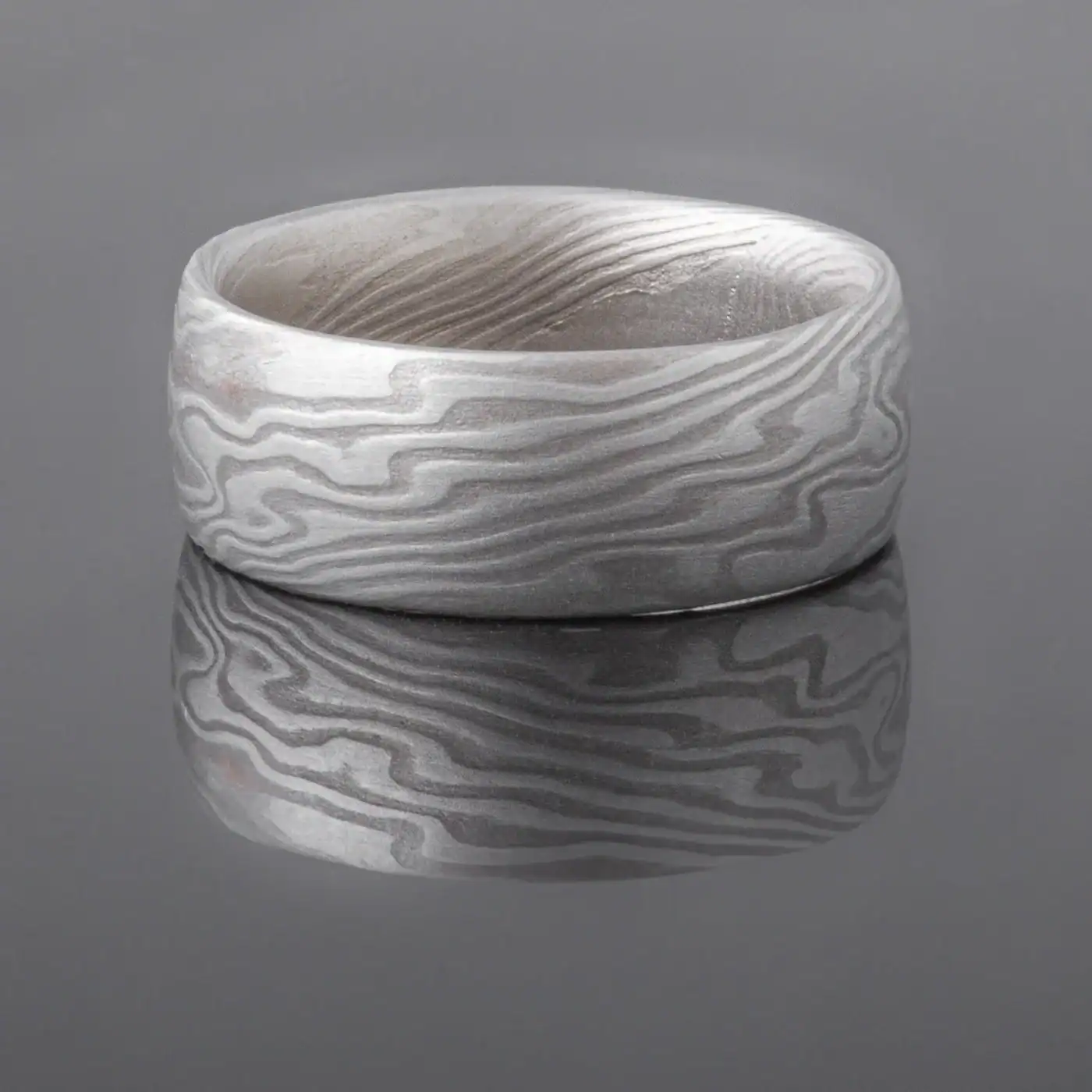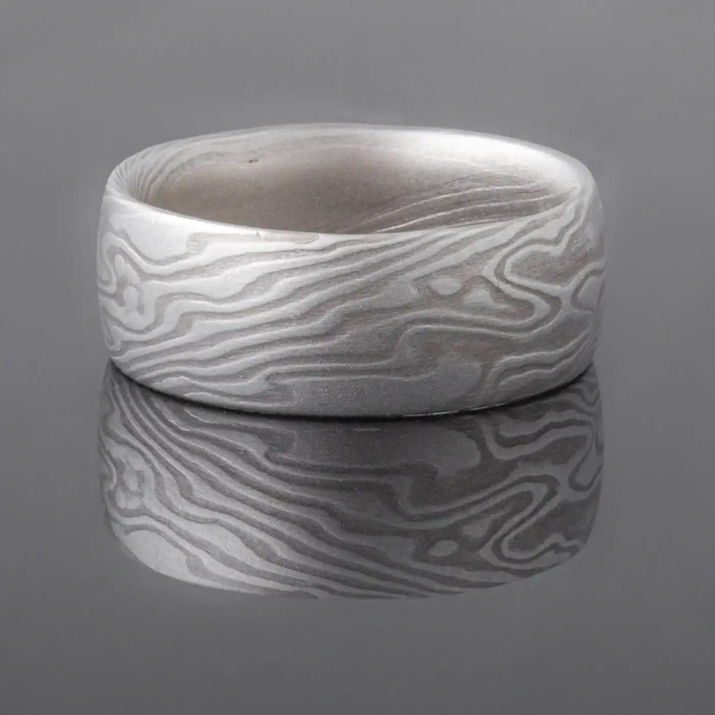 This subtle and elegant feeling mokume gane band is made in a palette of Shibuichi and sterling silver. Shibuichi is an alloy of silver and copper, providing an affordable option for quality mokume and craftsmanship. Arn has successfully created an alloy of silver and copper (shibuichi) which won't wear away over time as copper typically does when laminated in a Mokume Gane billet. This special alloy will allow our customers to have a low cost high quality alternative to typical Mokume Gane because there is no gold or palladium in these rings. These rings are lovely silver & grey tones and are made with Arn's gorgeous and unique patterns and amazing workmanship. If your budget and tastes allow you can add a red or yellow gold stratum layer, ridge line, or rails, to create a color pop. The options are endlessness because we are the rare breed of Mokume Gane artists who create work custom every time!